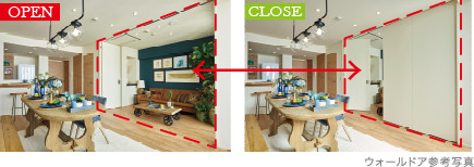 リビングを広く使ったり、個室として使用したり、生活シーンに合わせてフレキシブルに間取りを変更できるウォールドアを採用しています。※一部プランを除く