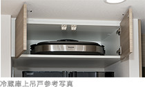 冷蔵庫置場上部のスペースを有効活用。ホットプレートやカセットコンロなどを収納するのに便利なスペースを設けました。