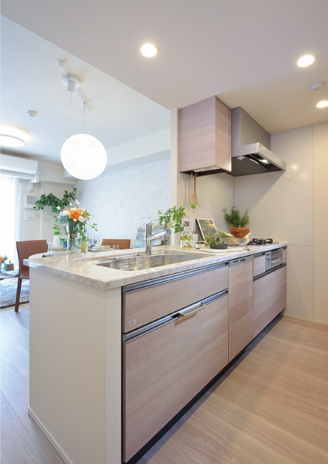 キッチンのカウンタートップは、美しく、メンテナンスも容易なフィオレストーンを採用。高級感あふれるキッチンを演出します。