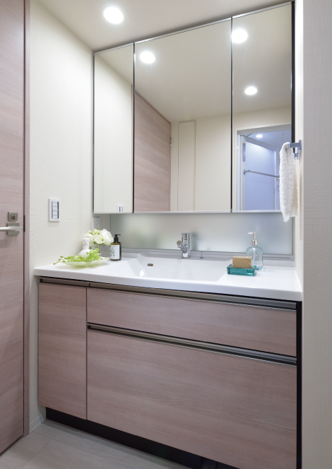 洗面化粧台の三面鏡の裏には、洗面用具などを機能的にしまえる収納スペースを確保しています。