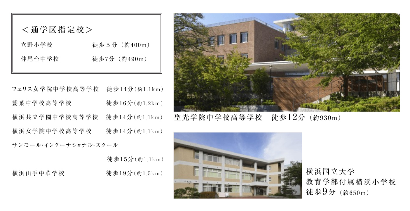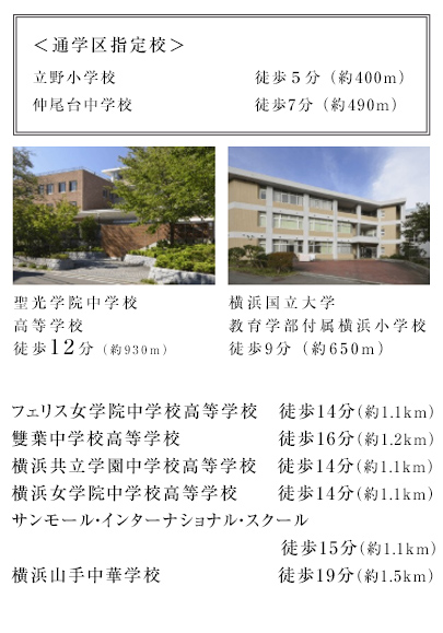 通学区指定校は「横浜市立立野小学校」と「横浜市立仲尾台中学校」。立野小学校は、平成20年度~22年度の3年間で実施された「文部科学省 学力向上実践推進校(生活科・社会科)※1」に指定されたり、外国文化に触れることができる地域環境を踏まえ、平成12年度から英語の授業を取り入れる※2など特色ある教育を行なっている。