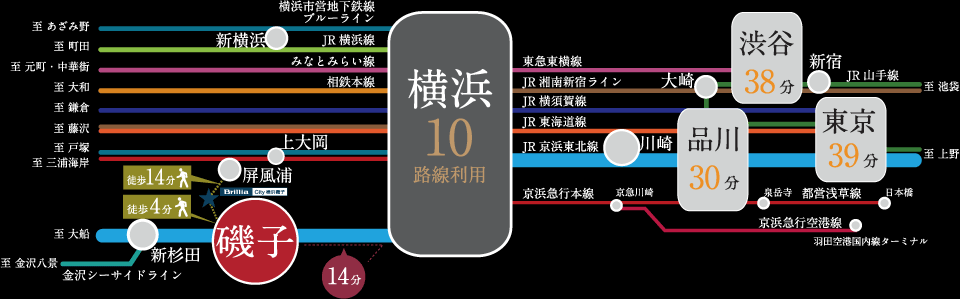 ※桜木町・横浜駅へはJR京浜東北線・根岸線利用。品川・東京駅へは横浜駅よりJR東海道線利用。渋谷・新宿駅へは横浜駅よりJR湘南新宿ライン利用。