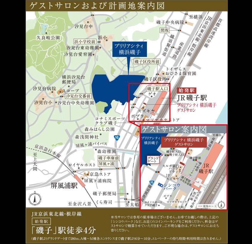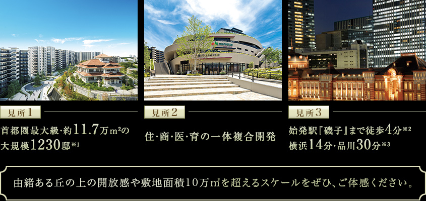 ※1平成20年1月から23年7月末までに首都圏(東京都、神奈川県、千葉県、埼玉県)で供給された新築マンション対象。(有)MRC調べ。 約11.7万㎡の面積は本プロジェクトの総開発面積を指したものです。 ※2磯子駅よりグランドゲートまで約280m。A棟~M棟各エントランスまで磯子駅より6分~10分。エレベーターの待ち時間・利用時間は含みません。 ※3横浜駅へはJR京浜東北線・根岸線利用。品川駅へは横浜駅よりJR東海道線利用。なお、掲載の所要時間は日中平常時のもので、時間帯により異なります。また、乗り換え、待ち時間は含まれておりません。