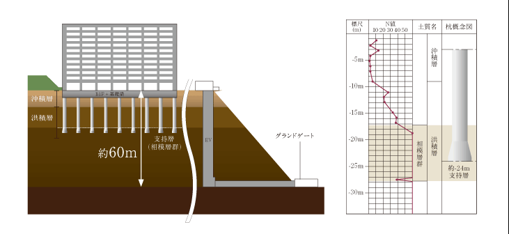 建物の耐震性を確保する上では、基礎が重要です。杭をしっかりと打ち込むための地盤となる支持層を探るため、「標準貫入試験」「室内土質試験」等の地盤調査(ボーリング調査)を綿密に実施。その結果、比較的浅い深度より杭の支持層に適した地盤となることを確認できました。杭先端深度は、各建物の位置ごとに十分な検討を行った上で、適切な長さとしています。