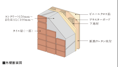 外壁の厚さは100mm以上を確保しました。屋外から室内に伝わる騒音を減少させるとともに、外気の影響を低減。さらに優れた断熱性も実現し、冷暖房効率の向上にも効果が期待できます。