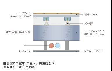 将来的な間取りの変更やメンテナンスに対応しやすい二重床・二重天井を採用しました。十分な配管・配線スペースを確保し、さらに水回りゾーンのフローリングとスラブ間を拡大し、配管・配線のメンテナンスを容易に行えるよう配慮しました。