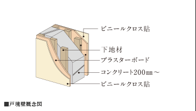 隣接する住戸と住戸の間を仕切る戸境壁は、遮音性を高めるために、コンクリートの厚さは200mm以上を確保しました。プライバシーや生活音に配慮し、快適な室内環境を創出します。