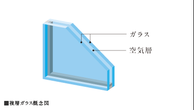 2枚のガラスの間に空気層を設け断熱性を高め、結露の発生を軽減し、建材の劣化を抑制します。